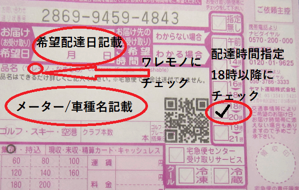 メーター(車種名)等の明記、時間指定18時以降着に